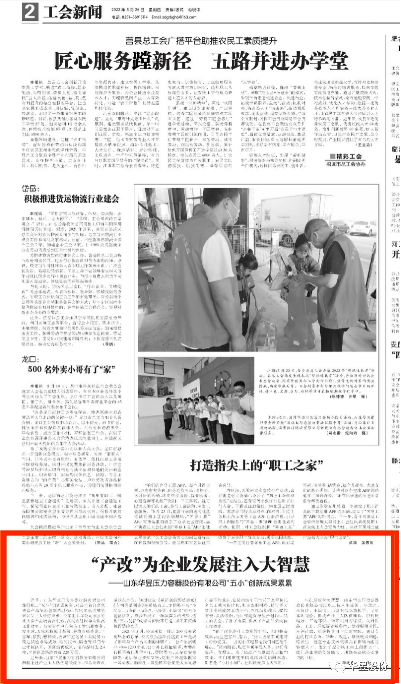 公司近年来持续开展职工的“小革新、小发明、小改造、小设计、小建议”等灵活多样、各具特色的群众性经济技术创新活动,不断把每一位岗位职工的想象能力、实践能力和创造能力转化成为技术成果,推动企业技术进步和高质量发展;公司“五小”创新发明事迹荣登山东工人报进行宣传报道。
