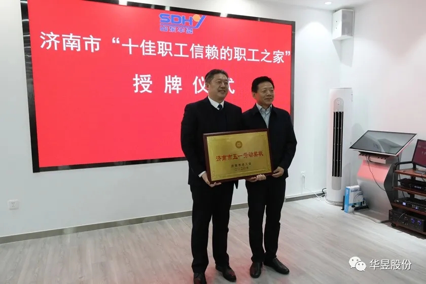 2020年11月26日,济南市总工会在山东华昱压力容器股份有限公司举行仪式,为山东华昱获评“十佳职工信赖的职工之家”、“济南市五一劳动奖状”送奖上门并授牌。济南市委常委、市总工会党组书记、主席雷天太,济南市总工会党组副书记、常务副主席傅金峰、长清区区委书记赵居安、济南市总工会党组成员、副主席于虹、济南市住建局总经济师、市民企服务队总领队闫卓然、市总工会一级调研员、市民企服务队长清区三队队长常江,长清区总工会党组书记宋传娥、五峰山街道办事处党委书记许兵、山东华昱董事长张立新等出席仪式。